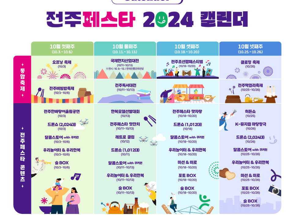 오는 2024년 10월에는 "더 맛있는 전주" 라는 슬로건 하에 전주의 모든 것을 담아 전주종합경기장에서 전주페스타 2024가 개최된다고 합니다. 10월 한달간 매주 진행한다고 하니 많은 관심과 전주라는 이름의 새로운 멋을 느껴보시기 바랍니다.